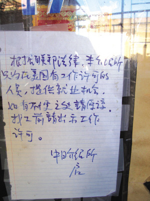 報道指出,在7日執(zhí)法行動中有一名石姓女子被捕的中日職業(yè)介紹所仍繼續(xù)關(guān)門,8日一早門上就張貼出中英文告示,明確告訴找工者必須有工作許可證。
