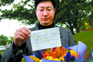 陳先生還特意買了兩束鮮花,其中一束粉紅色的玫瑰是他補(bǔ)送的情人節(jié)鮮花,他在寫給妻子的留言中說:“這次你要永遠(yuǎn)留著,不要再扔垃圾桶了!