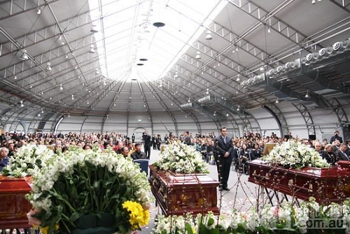 追思會的最后階段,所有親友和來賓陸續(xù)上前,向遺體告別并進獻獻花,會場內(nèi)響起了歌曲《回家》。下午一點,眾人目送靈柩離場。五具靈柩被運送前往麥夸里墓園。