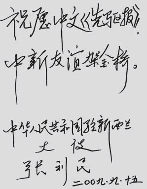 值此建國60周年之際,謹(jǐn)借《中文先驅(qū)報》之一隅,向大家的愛國愛鄉(xiāng)情懷深表贊賞和感謝,祝愿各位在事業(yè)上取得更大成績,為中新友好做出新的貢獻。