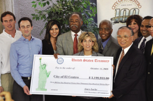 中新網(wǎng)10月16日電 據(jù)美國(guó)《僑報(bào)》報(bào)道,美國(guó)經(jīng)濟(jì)蕭條還沒有走出低谷,聯(lián)邦財(cái)政預(yù)算捉襟見肘。14日在帝王郡艾爾森特市政府(El Centro, Imperial County)舉行頒獎(jiǎng)典禮,聯(lián)邦商務(wù)部經(jīng)濟(jì)發(fā)展局(EDA)表彰華裔開發(fā)商美國(guó)YK集團(tuán)(YK America Group),對(duì)美國(guó)經(jīng)濟(jì)和創(chuàng)造就業(yè)的貢獻(xiàn),并獎(jiǎng)勵(lì)給他們由商務(wù)部長(zhǎng)駱家輝簽名的320萬(wàn)美元支票,用于商業(yè)開發(fā)區(qū)水電和道路的基礎(chǔ)建設(shè)。