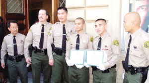 中新網(wǎng)9月20日電 據(jù)美國(guó)《僑報(bào)》報(bào)道,18日,在美國(guó)帕沙迪納市立劇場(chǎng)舉行的第378屆洛縣警局警察培訓(xùn)學(xué)校畢業(yè)典禮上,有4位亞裔警員現(xiàn)身在70名畢業(yè)生的行列當(dāng)中,其中包括兩名華裔,他們分別是圣蓋博居民何青源和柔似密居民陳得光。
