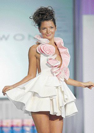 黃嘉宜是來自溫哥華的設計師。學時裝設計的她,在兩年前擁有了自己的時裝公司。她的設計以性感、女性主義和現(xiàn)代感著稱。她表示,在用廁紙設計時裝時,首先想到的是要給觀眾一種很難相信這衣服是用廁紙制成的感覺。因此,她特地要體現(xiàn)出與廁紙的柔軟相反的一種挺括的質地,于是要在廁紙下加硬襯。結果是,她的設計本身就有一種雕塑般的感覺。