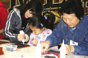 副會長鹿強(qiáng)當(dāng)天全家上陣,包括岳父岳母和妻子兒女在內(nèi)的一家六口全都來到了粘花現(xiàn)場,一起為世博會花車中國館模型粘貼由紅豆和黑豆組成的吉祥圖案,岳父方先生一邊干活一邊表示,能為世博會花車出一份力,這是他們?nèi)业淖院馈?/p>