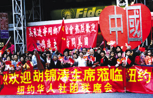 9月21日,中國(guó)國(guó)家主席胡錦濤抵達(dá)紐約出席聯(lián)合國(guó)峰會(huì),美國(guó)東部地區(qū)3000華人華僑聚集在紐約曼哈頓華爾道夫酒店附近,熱烈歡迎。歡迎人群來(lái)自紐約、新州、賓州、康州等地,大紐約地區(qū)各大高校也組織了上千留學(xué)生前往歡迎,F(xiàn)場(chǎng)有鮮艷的國(guó)旗及醒目多樣的歡迎標(biāo)語(yǔ),歌聲雷動(dòng)、歡呼聲不斷!稅(ài)我中華》、《大中國(guó)》、《歌唱祖國(guó)》等歌曲回蕩在曼哈頓上空。不少歡迎者更是興奮地跳起了舞,歡迎遠(yuǎn)方的貴客。歡迎人群中年齡最小只有10個(gè)月大,最大的已經(jīng)80多歲。中國(guó)駐美大使周文重代表胡錦濤向歡迎隊(duì)伍,以及美國(guó)的所有華人表示感謝。