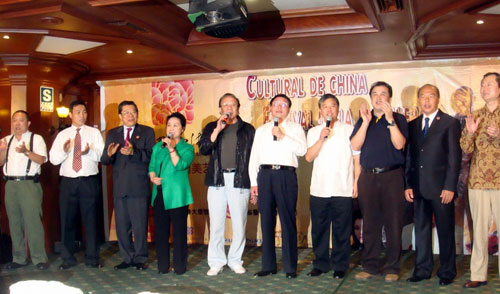 而為了感謝這份來(lái)自祖國(guó)的慰問(wèn),表達(dá)對(duì)藝術(shù)家們的歡迎,當(dāng)?shù)氐拿耖g團(tuán)體“愛(ài)華文藝社”的成員們,也奉獻(xiàn)出了自己最拿手的節(jié)目。他們一個(gè)個(gè)精心打扮、盛裝出場(chǎng),認(rèn)真的態(tài)度一點(diǎn)都不含糊。只見(jiàn)中華通惠總局主席蕭孝權(quán)換上了軍裝、戴上了假胡子,扮起了《沙家浜》中的吳司令;就連中國(guó)駐秘魯大使趙五一也和僑胞們打成了一片,頭上扎了白毛巾,扮起陜北的老農(nóng)民,唱起了《游擊隊(duì)之歌》,他們精彩的節(jié)目贏得了所有觀眾的笑聲與掌聲,令晚會(huì)一次次高潮迭起。