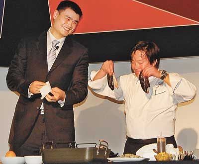 晚宴中最搞笑的節(jié)目莫過于華裔名廚蔡明昊教姚明制作北京烤鴨。蔡明昊不愧為艾美獎(jiǎng)得主,烹飪的過程中妙語連珠,連平日口才不錯(cuò)的姚明都“抖”不出這么多“包袱”。