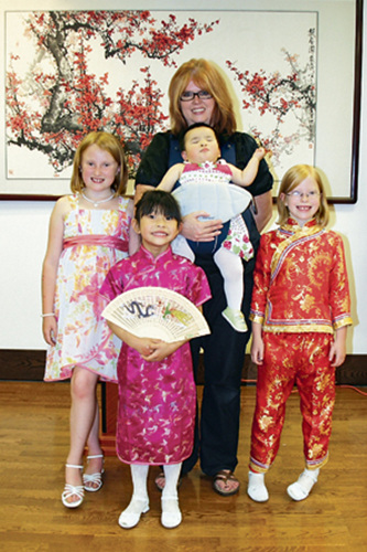 參加晚會(huì)的眾多家庭中,一位女士一直在胸前抱著一個(gè)中國(guó)女孩,無論觀看表演還是吃飯,從沒有把女孩放下過。她就是康肯(Lisa Konkin)?悼戏驄D已經(jīng)有6個(gè)孩子,年長(zhǎng)的4個(gè)已經(jīng)長(zhǎng)大成人,還有兩個(gè)女兒Caroline和Madeline。幾年前,康肯夫婦決定從中國(guó)收養(yǎng)孩子,經(jīng)過了近3年的漫長(zhǎng)等待后,才抱起現(xiàn)年6歲的Hanna-Lin。