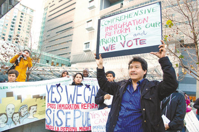 由亞裔、拉丁裔、非裔等不同族裔移民團體組成的“舊金山移民法律及教育聯(lián)絡(luò)網(wǎng)”,19日傍晚在舊金山聯(lián)邦政府大樓外示威集會。華人權(quán)益促進會移民政策統(tǒng)籌楊敏思指出,奧巴馬當選上任剛滿一年,即將于下周發(fā)表國情咨文,移民團體希望趕在國情咨文發(fā)表前,向奧巴馬政府要求立即推出移民改革法案。