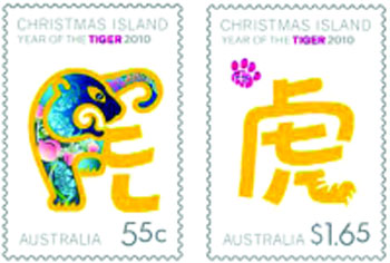 中新網(wǎng)1月13日電 據(jù)澳洲《星島日?qǐng)?bào)》報(bào)道,為紀(jì)念2010農(nóng)歷新年虎年的來臨,澳洲郵局特別推出一套由墨爾本設(shè)計(jì)師潘德妮設(shè)計(jì)的別致虎年郵票。