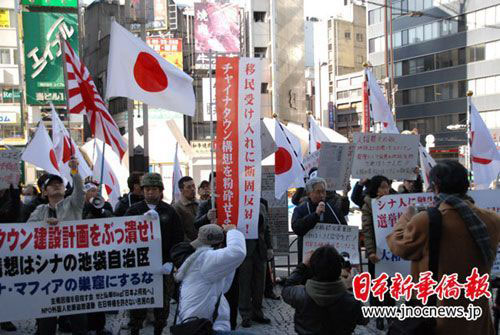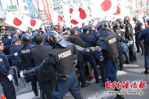 面對右翼分子的叫囂,“陽光城”的華人員工顯得非常沉著冷靜,依然熱情接待來到這里的每一位客人。在現(xiàn)場,日本警方也積極維護華人不受傷害。右翼分子在講演中攻擊中國留學生,一位中國女留學生勇敢地站出來,大聲說:“我是中國人,是中國留學生,你們都是‘右翼垃圾’!”當右翼分子要對這名女學生動手時,警員立即沖過來加以保護。