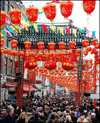 近年倫敦新年慶;顒游娜A人華僑、英國本地人乃至世界各國的游客超過20萬人。為迎接牛年,倫敦的唐人街區(qū)已掛滿了大紅燈籠,過年氣氛濃厚。倫敦華埠商會會長吳國強(qiáng)介紹說,今年的慶春活動從大年初一在唐人街的舞獅表演拉開帷幕;年初六在唐人街六角亭和石獅子旁開設(shè)春節(jié)攤位。