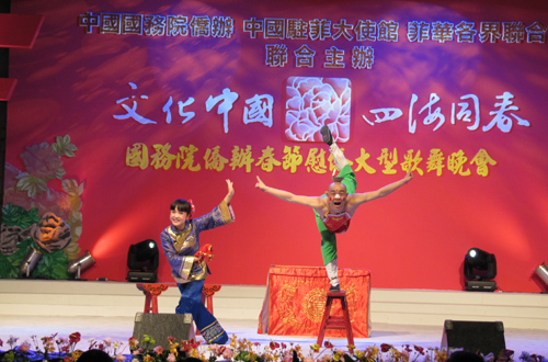 這是國務(wù)院僑辦和中國海外交流協(xié)會“文化中國·四海同春”2010年春節(jié)赴菲律賓藝術(shù)小組在演出,只見臺下掌聲不斷,臺上精彩紛呈:《滾燈》語言詼諧,情節(jié)幽默,將川北燈戲的民間生活情趣描繪得淋漓盡致。《變臉》是川劇中神奇美麗的絕技,大木偶變臉更是精彩絕倫,令人嘆為觀止。