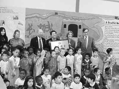在學(xué)校的體育館里,幼兒園學(xué)前班的師生們一起用牛奶盒搭建了立體長城,令參觀者驚嘆不已。孩子們還身著旗袍、唐裝,在中國歌曲聲中表演了舞蹈,他們揮舞著手中的中國扇子和雨傘,那童稚的動作和可愛的樣子贏得了家長和參觀者們的陣陣掌聲。舞蹈結(jié)束后,在馬里蘭大學(xué)孔子學(xué)院院長劉全生教授和小學(xué)校長泰斯滕博士主持下,舉行了孔子課堂的授牌儀式。