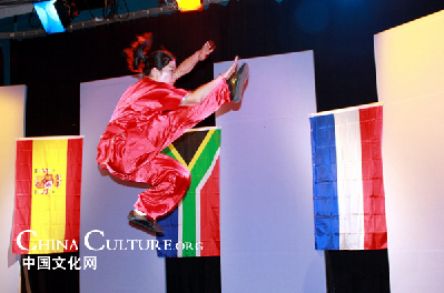 中國文化中心武術(shù)隊表演了南拳、長拳和三節(jié)棍等項目。他們在鏡頭前全神貫注、一絲不茍,最大程度地把自己所學(xué)完美地呈現(xiàn)給電視機前的觀眾。南拳套路短小精悍,結(jié)構(gòu)緊湊,手法多變,步法穩(wěn)健,并以聲助威,威猛迅疾,靈巧綿密,上肢及手型尤其富于變化;長拳套路姿勢舒展大方,動作靈活快速,剛?cè)岵,快慢相間,動靜結(jié)合,節(jié)奏分明,并帶有跳躍、跌撲和滾翻動作,非常精彩;而三節(jié)棍則是伸縮自如,三節(jié)相互轉(zhuǎn)換,方法多變,遠近兼顧,動作兇猛敏捷,氣勢逼人。棍法有劈、掃、掄、擊、戳、絞、格以及各種舞花,變幻無窮,令人驚嘆。這三個項目是文化中心的保留節(jié)目,深受武術(shù)學(xué)員們的喜愛。