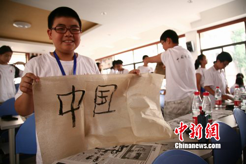 中新網(wǎng)成都7月30日電 (徐楊祎 張浪)30日上午,170多位參加“2010中國尋根之旅”夏令營四川營的海外華裔少年,來到位于四川大學(xué)的書法教室,學(xué)習(xí)中國書法。
