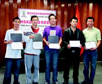 多倫多地區(qū)這次獲得獎學(xué)金的考生共有七位,他們于2008年參加HSK考試成績優(yōu)異而獲獎學(xué)金,并分別于2009年暑期前往北京語言大學(xué)、山東師范大學(xué)、北京語言文化大學(xué)、上海大學(xué)、華東師范大學(xué)、南京師范大學(xué)及黑龍江大學(xué),與來自五大洲的漢語學(xué)習(xí)者和愛好者一同學(xué)習(xí)漢語和了解中國文化,并到中國一些名勝古跡參觀旅游。