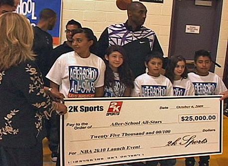 在洛杉磯的一個叫做《大家都是大明星課后輔導(dǎo)項目》的捐款儀式上,科比主持籃球電子游戲比賽,讓他的湖人隊同伴以及快艇隊的兩個球員戈登和卡曼大戰(zhàn)中學(xué)生,在游戲?qū)购,布萊恩特把一張兩萬五千美元的支票,捐給了洛杉磯輔導(dǎo)項目的執(zhí)行長坎波斯。