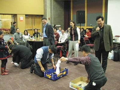 成語接龍和逢七數(shù)數(shù)也引爆了全場(chǎng)的笑聲,使全場(chǎng)沸騰的則是游戲“七拼八湊”。游戲中,呂敏偉將與會(huì)者分為“左派”和“右派”,要求兩派老師同心同德,以最快速度籌集現(xiàn)場(chǎng)報(bào)出的物品。兩派人員總動(dòng)員,紛紛將手表、錢、書包、鋼筆、口紅等取出,拋進(jìn)箱子。最令人捧腹的是,有的老師脫下了襪子,獻(xiàn)出了皮帶,最后由右派險(xiǎn)勝。當(dāng)天聯(lián)歡會(huì)上到處充滿歡聲笑語,以及對(duì)彼此的新年祝福。