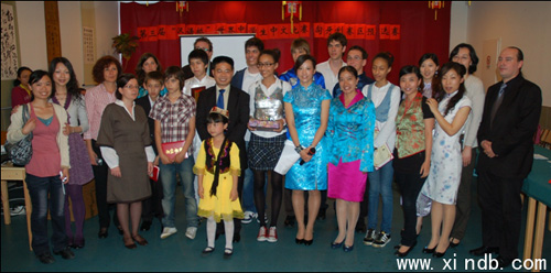 第三屆“漢語(yǔ)橋”匈牙利賽區(qū)的第一名由匈中雙語(yǔ)學(xué)校的心情獲得,王慶年為她頒發(fā)了獎(jiǎng)狀和獎(jiǎng)品;第二名由羅蘭大學(xué)孔子學(xué)院的丹尼爾、周德偉,東方語(yǔ)言學(xué)校的李麗獲得,艾爾戴伊校長(zhǎng)為他們頒發(fā)了獎(jiǎng)狀;其余的同學(xué)獲得了三等獎(jiǎng),賽后全體成員合影留念。