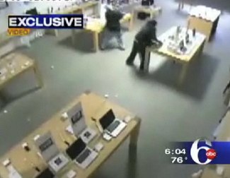 從監(jiān)控錄像看,5名劫匪破窗而入,頭部蒙著面罩,進店后便瘋狂開搶。整個搶劫過程僅持續(xù)了31秒鐘,有23部MacBook Pros筆記本,14部iPhone(iPhone玩家論壇)手機和9部iPod被搶。