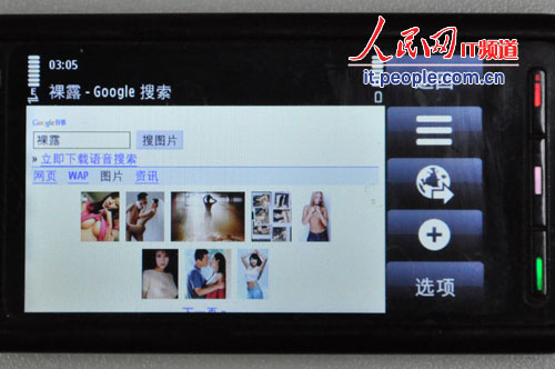 在搜索視頻內(nèi)容時,輸入“激情 視頻”后,手機立刻顯示出許多帶有不堪入目圖片的鏈接,其中第一個便是名為“美女視頻美女艷舞”,谷歌在這次打擊手機色情行動中的反應(yīng)可見一斑。