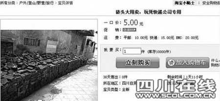 近日,店主“千尋kission”在淘寶網(wǎng)上發(fā)布了“磚頭大甩賣,玩死快遞公司專用”的銷售標(biāo)題,表示將以5元一斤的價格販賣磚頭。其中的產(chǎn)品說明還頗有幾分《武林外傳》中呂秀才的風(fēng)采:“泄憤也可用磚頭,本磚頭專為對付那些服務(wù)態(tài)度不好的快遞送貨員設(shè)計,如果你們對那些惹您生氣的快遞員投訴無門,無處泄憤請拍下此產(chǎn)品!