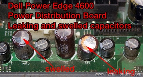 第一臺是PowerEdge 4600托管服務器,首先是四個熱插拔電源之中的一個出現(xiàn)問題,導致服務器宕機。拆除問題電源后,利用其他三個電源繼續(xù)運轉了9個月時間。結果又有一個電源出現(xiàn)問題。打開機箱后發(fā)現(xiàn),控制電源系統(tǒng)的主板部分的電容器出現(xiàn)了膨脹,泄露。