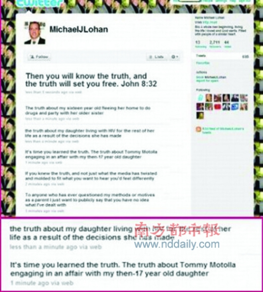 27日,林賽·羅韓的父親邁克爾·羅韓在Twitter稱女兒染上艾滋病,還說她17歲時曾與瑪莉亞·凱利的前夫Tom myMottola有染。邁克爾說,林賽現(xiàn)在的行徑如此荒唐,完全是因為得了艾滋病,因此她決定就這樣渾渾噩噩過一生!但很快邁克爾卻突然將消息撤下,聲稱自己的Twitter網(wǎng)頁被黑客入侵,網(wǎng)頁上所言都不是事實。事后有網(wǎng)友調(diào)查,發(fā)覺他的網(wǎng)頁沒有被入侵,證實他在說謊。