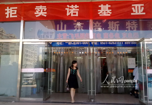 諾基亞與經(jīng)銷商的矛盾持續(xù)發(fā)酵,迅速在全國(guó)各地蔓延。繼杭州經(jīng)銷商抗議諾基亞對(duì)竄貨課以重罰,打出要求諾基亞歸還血汗錢的橫幅后,今天山東諾基亞經(jīng)銷商再度發(fā)飆,在濟(jì)南市場(chǎng)山東通訊城打出《拒賣諾基亞》的條幅。