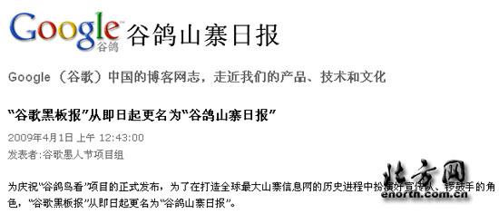 同時,為慶!肮萨濜B看”項(xiàng)目的正式發(fā)布,谷歌中國的官方博客“谷歌黑板報”也在今日“撰文宣布“改名”為“谷鴿山寨日報”。該博客稱:“為了在打造全球最大山寨信息網(wǎng)的歷史進(jìn)程中扮演好宣傳隊(duì)、鑼鼓手的角色,‘谷歌黑板報’從即日起更名為‘谷鴿山寨日報’”。但記者注意到,該日志的發(fā)布者署名為“谷歌愚人節(jié)項(xiàng)目組”,想必“谷鴿鳥看”和“谷鴿山寨日報”的改名行動都是今天這個特殊節(jié)日的一部分。