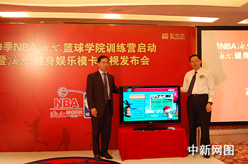 秉承NBA的體育及娛樂精神,在此次啟動儀式上,作為NBA官方指定使用電視產(chǎn)品——海爾彩電推出了健身娛樂?娨,并發(fā)布了“云媒體”戰(zhàn)略。海爾集團信息產(chǎn)品本部總工程師翟翌立博士介紹,海爾推出“健身娛樂?ā彪娨曋荚谧尭嗟娜俗悴怀鰬艟涂梢钥鞓方∩聿Ⅲw會NBA精神。同時,隨著網(wǎng)絡時代的來臨,針對不同使用習慣用戶的需求,海爾彩電推出了“搜狐在線網(wǎng)絡?ā焙汀把咐紫螺d網(wǎng)絡?ā,使得人們可以在家通過電視一鍵上網(wǎng)看高清大片,還將聯(lián)合更多的網(wǎng)絡內(nèi)容提供商,讓用戶無需擔心個人儲存設備空間的限制,可以隨時、無限量地自由選擇自己所需要的網(wǎng)絡內(nèi)容資源。