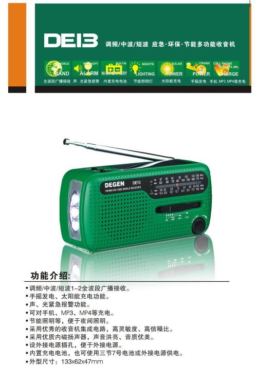 在缺電的災(zāi)區(qū),隨同前往的德勁電子公司研發(fā)人員發(fā)現(xiàn),如果能讓收音機兼?zhèn)涫謾C充電器和手電筒的功能,就能解決晚上照明和個人應(yīng)急通信。幾個月后,一款集應(yīng)急、環(huán)保、節(jié)能等多功能于一體的收音機新品——德勁DE13研發(fā)成功并投放市場。德勁DE13具有全波段收音、手搖發(fā)電、太陽能充電功能,而且可以對手機、MP3、MP4等進行充電,該機還配有節(jié)能照明燈,便于夜間照明。該機型投放市場后,還受到了許多戶外一族的追捧,由于特有的手搖發(fā)電、太陽能充電功能(機器內(nèi)置充電電池),外出旅游的時候不僅可以收聽廣播,了解新聞動態(tài)和天氣變化情況,還可以為手機充電。DE13還具有聲光警報功能,當(dāng)遇到危險和需要救助時,利用收音機發(fā)出來的求救聲音和紅色閃光,引導(dǎo)救援。