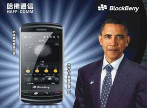 中國某公司生產的這款山寨手機叫做BlockBerry 9500,它的宣傳語是:“奧巴馬用BlackBerry,我用BlockBerry”。