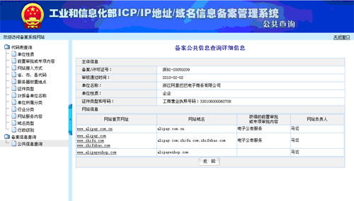 記者同時(shí)在工信部域名備案系統(tǒng)查詢發(fā)現(xiàn),相關(guān)域名已經(jīng)于2010年2月2日通過審核,申報(bào)單位為浙江阿里巴巴電子商務(wù)有限公司,且域名所匹配的ICP證號(hào)正是目前支付寶所使用的ICP證號(hào)。