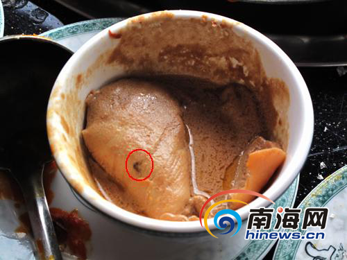 據(jù)周先生介紹,當天下午1時許,他和朋友4人來到大英路重慶劉一手火鍋吃飯,這頓飯一共消費了160元。但是在吃飯的過程中,他們首先發(fā)現(xiàn)鍋里有一根類似頭發(fā)的東西,然后他們叫該店負責(zé)人來查看,該負責(zé)人看后對他們表示歉意,他們就姑且不追究。