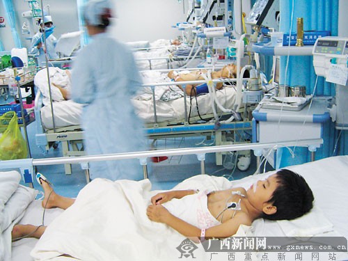 6月23日下午2時(shí),記者趕到貴港市人民醫(yī)院時(shí),正遇見自治區(qū)衛(wèi)生廳、教育廳的領(lǐng)導(dǎo)前來看望中毒的幼兒。在醫(yī)院外科樓二樓的重癥監(jiān)護(hù)室內(nèi),5名幼兒正在接受救治,其中3名病情較重。一名看起來只有四五歲的小孩口鼻插著導(dǎo)管,躺在床上不停地抽搐。醫(yī)生告訴記者,這名幼兒身體素質(zhì)較差,被送到醫(yī)院搶救后出現(xiàn)了血尿、高燒、肺水腫等癥狀,有病情加重的趨勢。后來,經(jīng)過搶救,病情得到緩解。