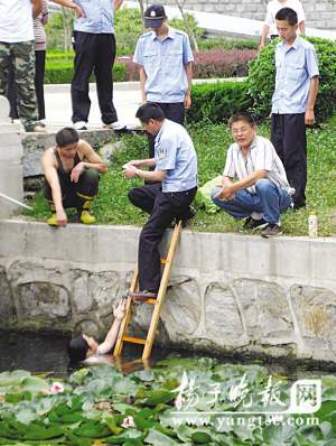 女子與眾人僵持了半個(gè)小時(shí)后,一位民警無(wú)意中與其提到“錢”,該女子突然表現(xiàn)出極大的興趣:“你給我錢,我就上去!泵窬统鰞蓮埌僭筲n在岸上晃了晃,哄道:“先上來(lái),上來(lái)我就給你!痹诒娙说膭裾f(shuō)和鈔票的吸引下,該女子終于同意穿上衣服上岸。在上岸之前,她還從河中摘了一朵蓮花獻(xiàn)給警察,以示“感謝”。據(jù)悉,該女子姓孫,35歲,11年前,因戀愛(ài)問(wèn)題,患上狂躁癥,先后多次被送到精神病院治療。(紹平 萬(wàn)春 李根 小川)