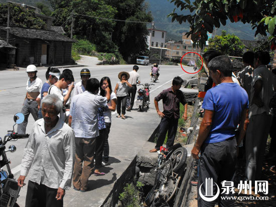 記者昨日上午10時(shí)趕到位于永春達(dá)埔鎮(zhèn)東園村委會(huì)附近的事發(fā)現(xiàn)場(chǎng)時(shí),警方仍在現(xiàn)場(chǎng)勘察。據(jù)了解,死者張某泉今年38歲,家住在距東園村五六公里遠(yuǎn)的錢峰村!叭颂稍谶@個(gè)地方,摩托車卻翻倒在100多米外的水溝里!睆埬橙囊晃挥H戚指著路對(duì)面的涼棚告訴記者,張某泉的遺體就停放在那里。