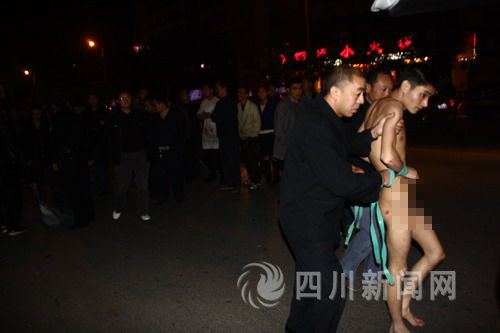昨日凌晨40分左右,涪城區(qū)御營(yíng)壩鄧氏火鍋門口圍著一大堆人,一名20來(lái)歲的小伙正將一輛白色汽車攔在馬路中間,神色緊張,情緒激動(dòng),并手舞足蹈地口說(shuō)著什么,特別令人費(fèi)解的是,該男子身上居然沒(méi)有一件衣物——完全裸露。其中一名圍觀的市民說(shuō),他和同伴路過(guò)此地時(shí),看見這名青年男子正瘋狂地?cái)r截車輛,好像很焦急的樣子。為了不影響交通以及該男子的人身安全,他便撥打了110。
