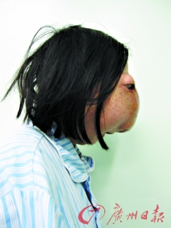 吳小燕的父親告訴記者,小燕九歲時突然雙眼失明,當?shù)卦\斷為視神經(jīng)瘤。隨后面部開始畸形腫大,逐漸失去嗅覺,鼻子也無法呼吸。