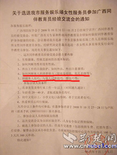 通過“糜瑞蘭”上傳的宣傳單照片,可以很清楚的看到這份全稱為《關于選送我市服務娛樂場女性服務員參加廣西同伴教育員經(jīng)驗交流會的通知》的宣傳單中,抬頭為“各服務娛樂場所”,落款為“宜州市疾病預防控制中心”并蓋有相應公章,其正文中列明交流會的主要內(nèi)容包括“……4、如何判斷客人的消費能力……5、招攬客人技巧,與客人討價技巧,性技巧等”。該圖文內(nèi)容隨即被多個論壇轉(zhuǎn)載。