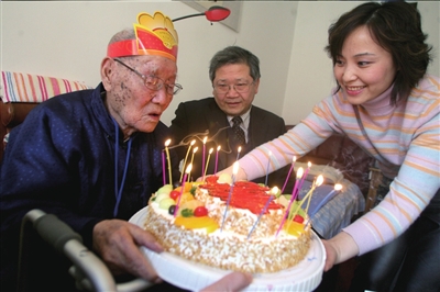 “一,二,三,吹……”長壽肝癌患者王會川笑呵呵地接受眾人的祝福。昨天,在老人位于玉蜓橋附近的家中,北京中醫(yī)藥大學(xué)東方醫(yī)院的醫(yī)護(hù)人員為他提前慶祝生日。