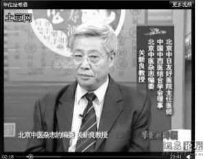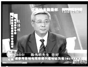 在一家電視臺(tái)播出的億康納米能量杯的廣告中,一位學(xué)者打扮的人端坐當(dāng)中,文字顯示,他叫陳偉明,是中國醫(yī)促健康飲水協(xié)會(huì)理事。而在另一幅華佗延壽酒的廣告視頻截圖中,還是那位“陳偉明”,可文字顯示其姓名卻變成了關(guān)新良,身份也變成了《北京中醫(yī)》雜志編委、中國中西醫(yī)結(jié)合協(xié)會(huì)理事、北京中日友好醫(yī)院主任醫(yī)師。第三幅截圖來自天地磁療儀的電視廣告,這個(gè)“陳偉明”又成了一名心臟病患者,一臉痛苦表情。