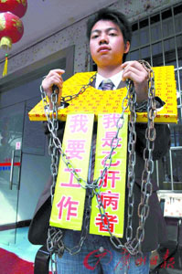 “我是乙肝病者,我要工作”,2月13日上午,廣州南方人才市場(chǎng)附近,來(lái)自江西的大學(xué)生羅思文眉頭緊皺地戴著自制的紙“枷鎖”,透過(guò)掛在胸前的標(biāo)語(yǔ),發(fā)出那痛徹心扉的無(wú)聲吶喊。此前,羅思文費(fèi)盡千辛萬(wàn)苦通過(guò)了一家用人單位的考核,卻因?yàn)椤按笕?yáng)”而被拒之門外。