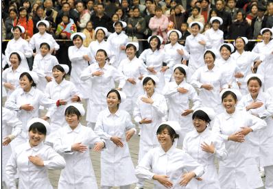 昨日,解放碑,300護(hù)士跳“乳房保健操”。解放碑中心廣場音樂飛揚(yáng),一群“護(hù)士小姐”排著整齊的隊(duì)伍,擴(kuò)胸、伸展、按摩……一個(gè)個(gè)優(yōu)雅但不失力度的動作,展示著健康的活力。隊(duì)伍的表演吸引著大批過往的行人駐足觀看。原來,在三八婦女節(jié)到來之際,為響應(yīng)重慶市委市政府建設(shè)“健康重慶”的號召,醫(yī)護(hù)人員舉辦了“健康重慶,關(guān)愛婦女”大型公益活動,F(xiàn)場二十名專家的義診活動,巧妙地向市民傳達(dá)乳腺保健的意識以及日常防病治病的知識。(記者 劉嵩 攝影報(bào)道)