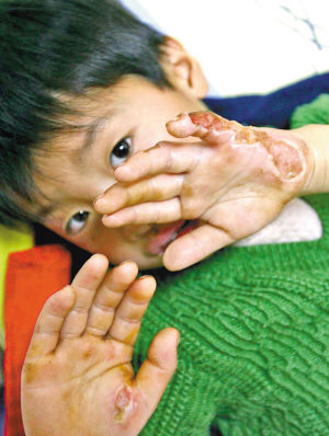 昨日,記者在重慶市兒童醫(yī)院外科病房里看到了這個(gè)男孩,在媽媽陪同下他正在輸液。男孩叫何昊陽,躺在病床上會(huì)說會(huì)笑,只是雙手手背有烏紅的印記和水泡,右手無名指和小指皮膚裂開。叫他動(dòng)一動(dòng),何昊陽雙手手指也能聽話地一伸一捏。