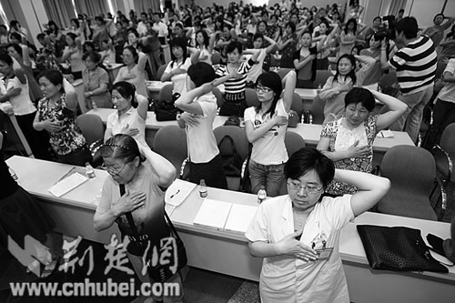 “乳房疾病很煩惱,自我檢查很重要,先舉手,后叉腰,對著鏡子仔細瞧……”昨天,一群女性在同濟醫(yī)院醫(yī)生帶領(lǐng)下,吟誦《乳房自查口訣》,做瑜伽操。