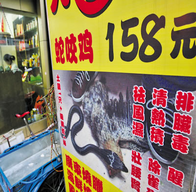 “打死我都不敢吃!”市民劉先生在黃泥塝看到某餐館推出的“蛇咬雞”招牌后說,這些吃法太怪了。劉先生介紹,招牌上還說,吃“蛇咬雞”可以醒腦、除雀斑、排臟毒、祛風(fēng)濕等。“這不僅太殘忍,太血腥,也不道德!睆埮空f,希望這僅僅是個別餐館吸引顧客而搞的噱頭。