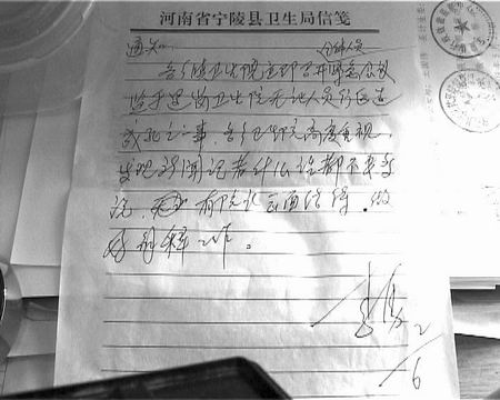 “寧陵縣邏崗鎮(zhèn)衛(wèi)生院沒(méi)有行醫(yī)資格的醫(yī)生給我兒媳接生,導(dǎo)致胎死腹中!6月1日,商丘市民權(quán)縣伯黨鄉(xiāng)村民郭漢章打來(lái)熱線反映。而記者在采訪中,卻意外地發(fā)現(xiàn)一份該縣衛(wèi)生局長(zhǎng)簽名的通知,要求:“各鄉(xiāng)衛(wèi)生院高度重視,發(fā)現(xiàn)新聞?dòng)浾,什么話都不要多說(shuō)……”(如左圖)據(jù)郭漢章介紹,5月1日傍晚,兒媳趙婭君感到腹部陣痛,家人立即將其送入寧陵縣邏崗鎮(zhèn)衛(wèi)生院檢查!爱(dāng)晚做B超檢查時(shí),醫(yī)生說(shuō)胎音、羊水一切正常。第二天早上6點(diǎn),醫(yī)生王美英叫來(lái)一個(gè)人,一起將兒媳送進(jìn)產(chǎn)房后,兩個(gè)人不停地在兒媳腹部擠壓,一個(gè)半小時(shí)后,趙婭君全身顫抖,面色異常。做了檢查后,證實(shí)其腹中胎兒已經(jīng)死亡。”
